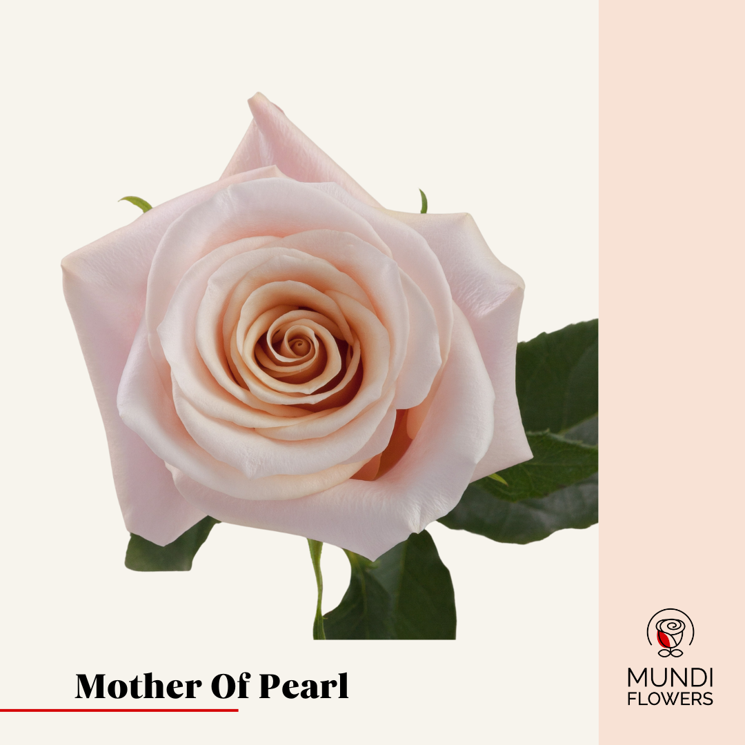 The Mother of Pearl rose captivates with its delicate blush pink and peach hues, enhanced by a subtle iridescent sheen reminiscent of a seashell’s glow.